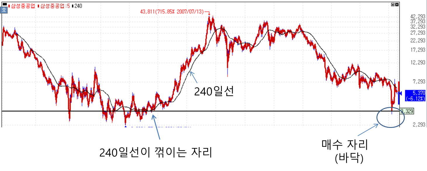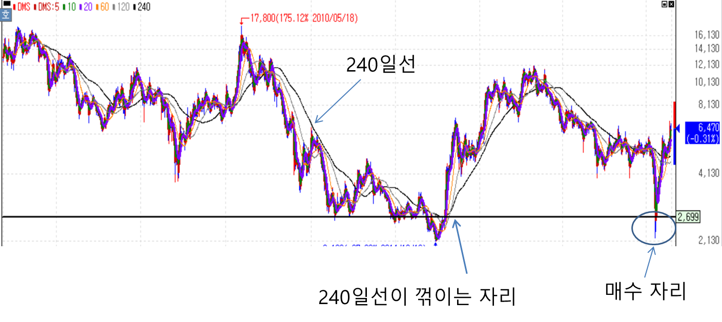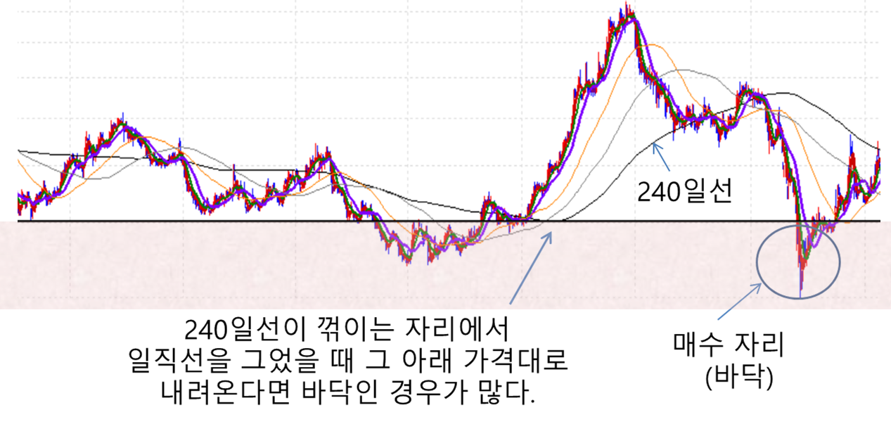 240일선이(흑색선) 아래로 내려오다가 위로 꺾이는 지점에서 일직선을 그으면 됩니다. 그 아래가 바로 바닥이 되는 것입니다. 쉽지 않나요? 이는 일반투자자도 찾기 쉬우면서도 아주 간단한 방법입니다.