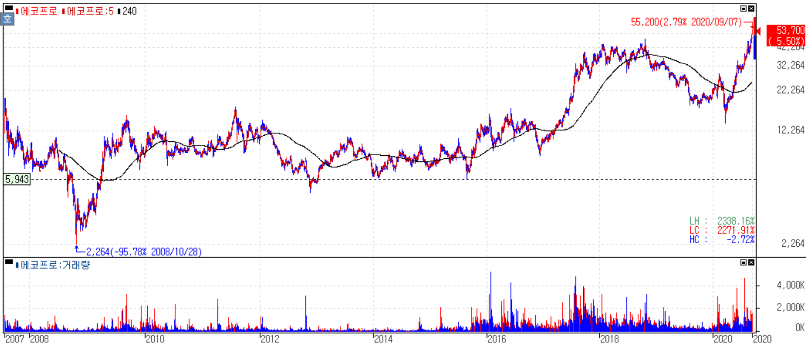 - 현재 에코프로는 53,000원을 넘어서고 있습니다. (20년 8월 기준)