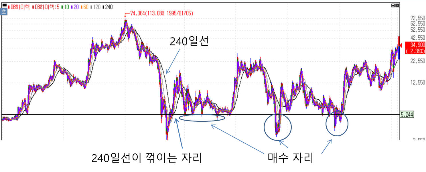 - DB하이텍의 경우 5,280원 부근이 240일선이 꺽이는 자리입니다.