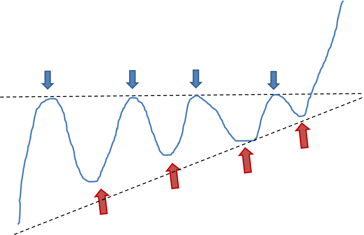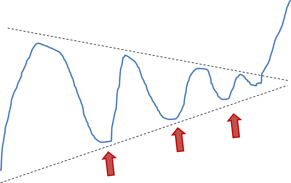 그림에서 보는 바와 같이 어떤 한 가격대를 계속 두드리며 저점을 높여가는 것이 '역삼각형 수렴 패턴'입니다. 이런 패턴으로 주가가 상승하고 있다면 매수하는 것이 좋습니다. 해당하는 가격대를 뚫고 올라가겠다는 의지를 차트에서 보여주는 것이기 때문입니다.