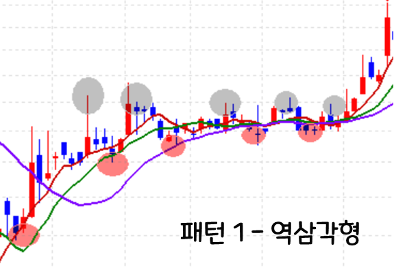 아, 이 삼각수렴패턴매매 방식에는 두가지 패턴이 있습니다. 역삼각형패턴과 그냥 일반삼각형 패턴입니다. 먼저 역삼각형패턴을 알아보도록 하겠습니다.